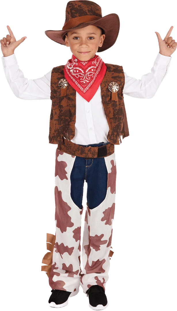 Shoot up the cowboy competition in the Child Cowboy Costume with Hat! The costume includes cow print chaps, waistcoat, red bandana and cowboy hat.