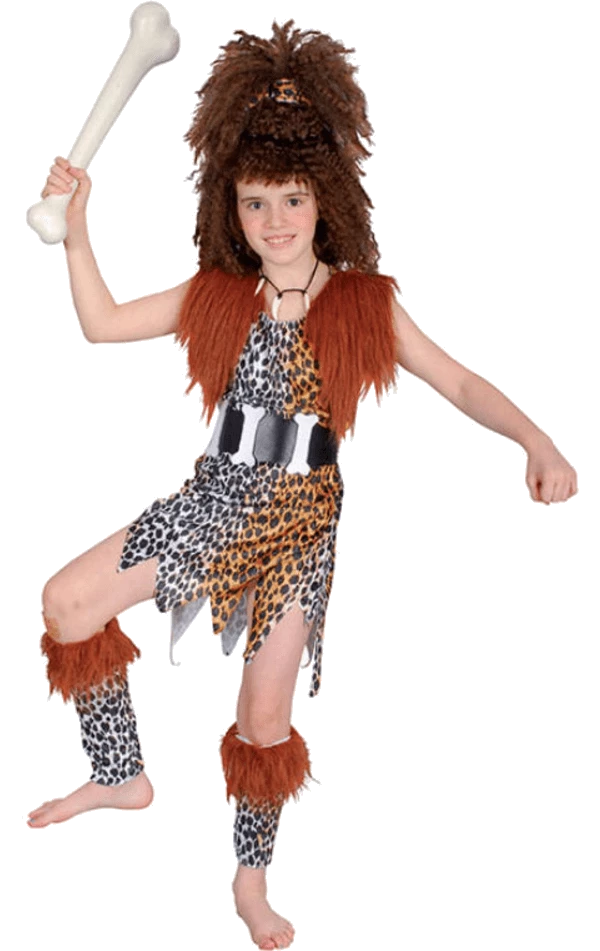 Look prehistoric in the Child Cavegirl and Wig Costume! The costume includes a leopard print dress with jagged edging, belt, wig and leg covers.