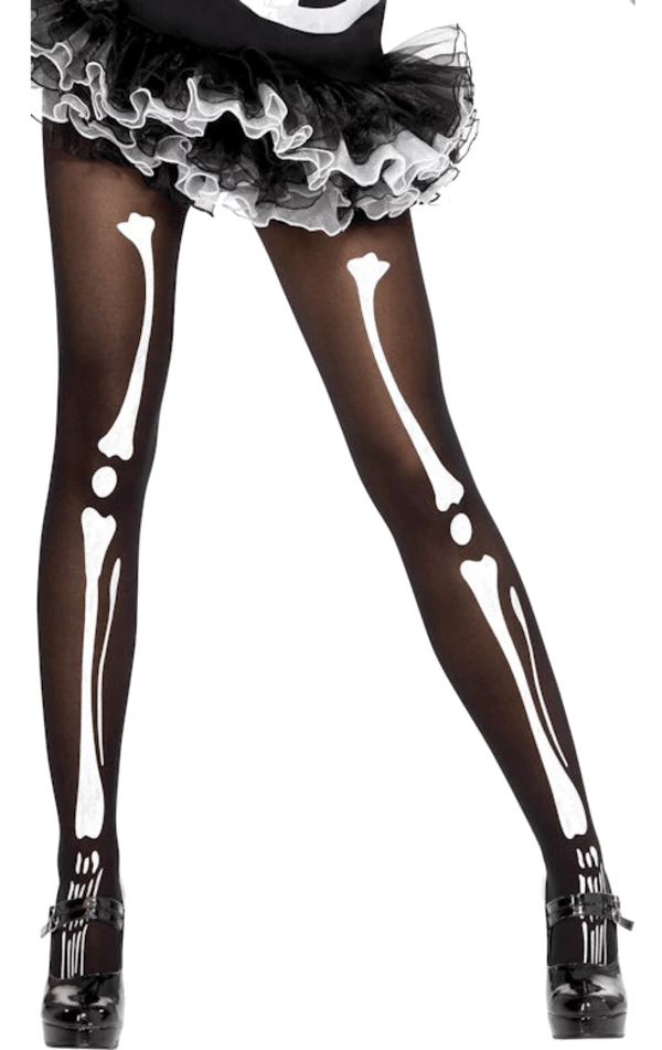 One pair of black tights with printed bones on the legs. An ideal accessory for Halloween costumes. One size: up to UK dress size 12.