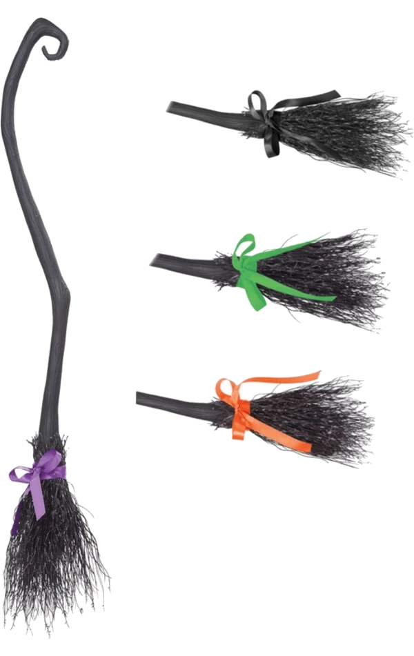 Black PVC wood effect two piece broom set consisting of 4 separate interchangeable coloured ribbons of purple, orange, black and green. Pick a colour to match your costume!