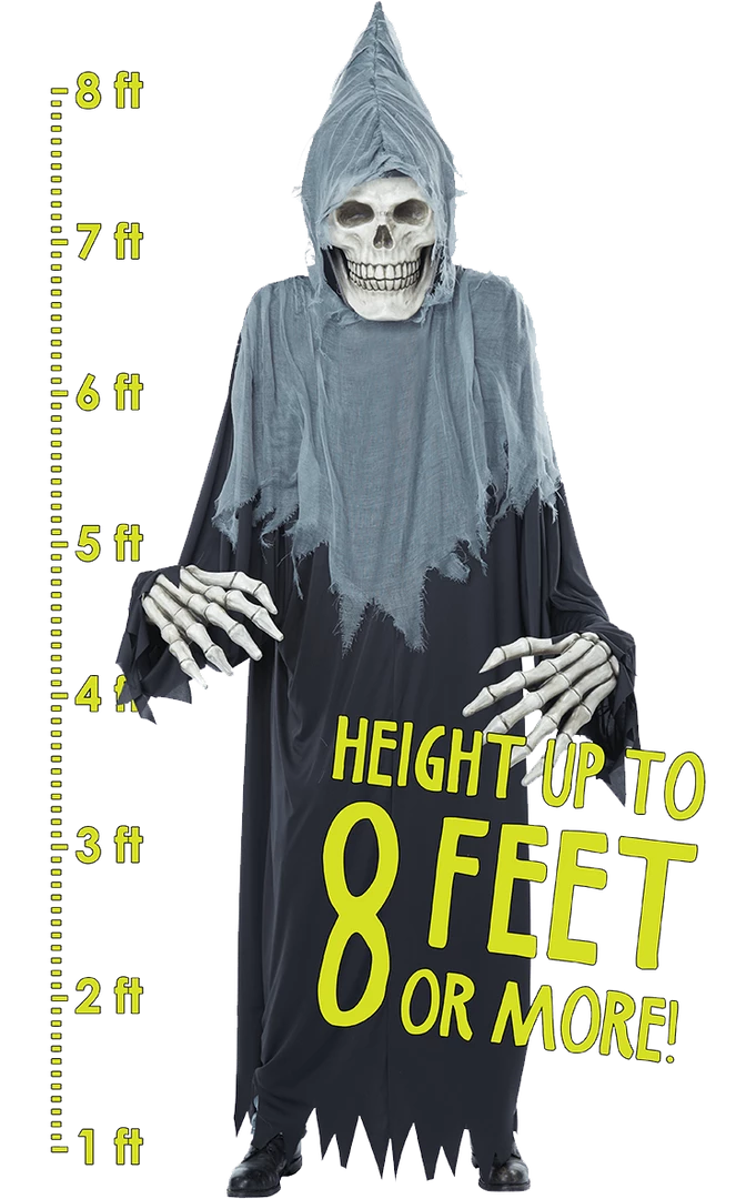 Be by far the scariest guest at any Halloween costume party with the enormous and terrifying Towering Reaper Costume! This huge Grim Reaper costume adds two extra feet to you when you wear it with an inflatable head and shoulder piece, and can make the wearer over eight feet in height. The fabric chest piece lets you see through it, and the hands are easily attached to your own. It can also be used as a horrifying Halloween decoration to scare trick or treaters! It will definitely cause a scream!