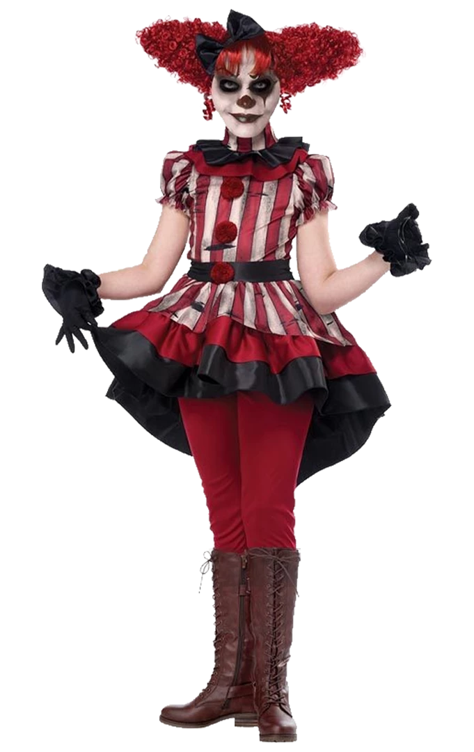 Make your little horror stand out in spooky style this Halloween in the Kids Wicked Klown Costume! This unique costume contains everything she needs to be suitably scary with a striped top and skirt, red slim-fit trousers, a sinister clown mask, gloves and cuffs.