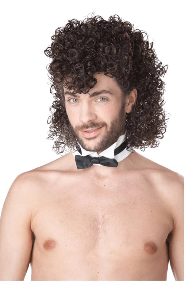 Become a star stripper with this super-hot permed mullet style wig. The Male Stripper Brown Wig set also includes a white collar with black bow tie to complete the outfit. Now you have everything you need for the fantastic comedy fancy dress costume!