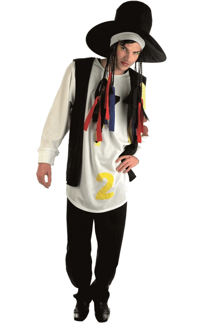 The Adult 80s Pop Star Costume includes the slouchy top and waistcoat fashionable at the time, a dreadlock adorned wig and of course, that legendary Karma Chameleon hat!