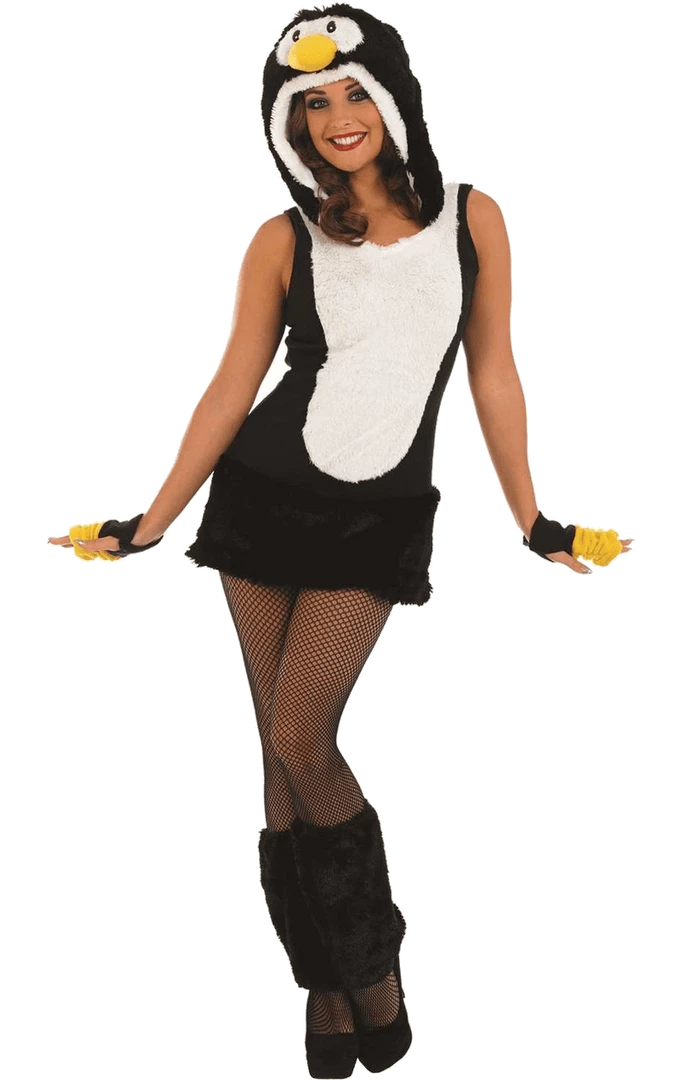 Everyone loves penguins, but they will absolutely adore you dressed up as this pretty Adult Sexy Penguin Costume. This fluffy outfit comes with a short black dress that has a white penguin belly and attached hood featuring a cute penguin head.