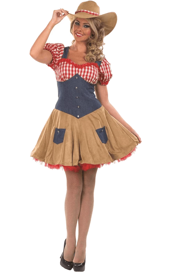 If you climb in the saddle, be ready for the ride! Channel sharpshooter Annie Oakley in this cute but practical Adult Cowgirl Costume. The classic denim and gingham style dress is perfectly paired with a matching Stetson for true Cowgirl style. You’ll have all the Cowboys calling ‘yee-haw’ as you ride by.