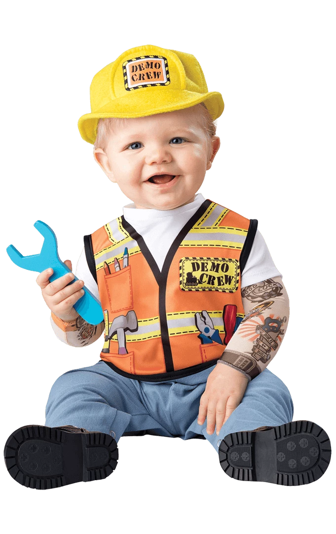Let us help you to build dreams with the adorable Baby Builder Costume! This cute constructor costume comes complete with a poppered jumpsuit for swift nappy changes and a matching (soft)hard hat! The jumpsuit even includes fake tattoo sleeves under the high vis jacket for a real working man look!
