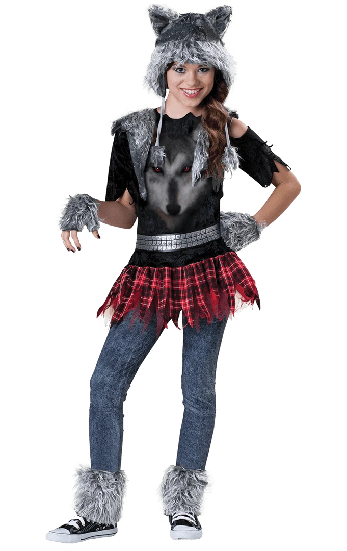 Howl to the moon in our Wearwolf Tween costume! Includes t-shirt, skirt, gloves, boot tops and furry hood.