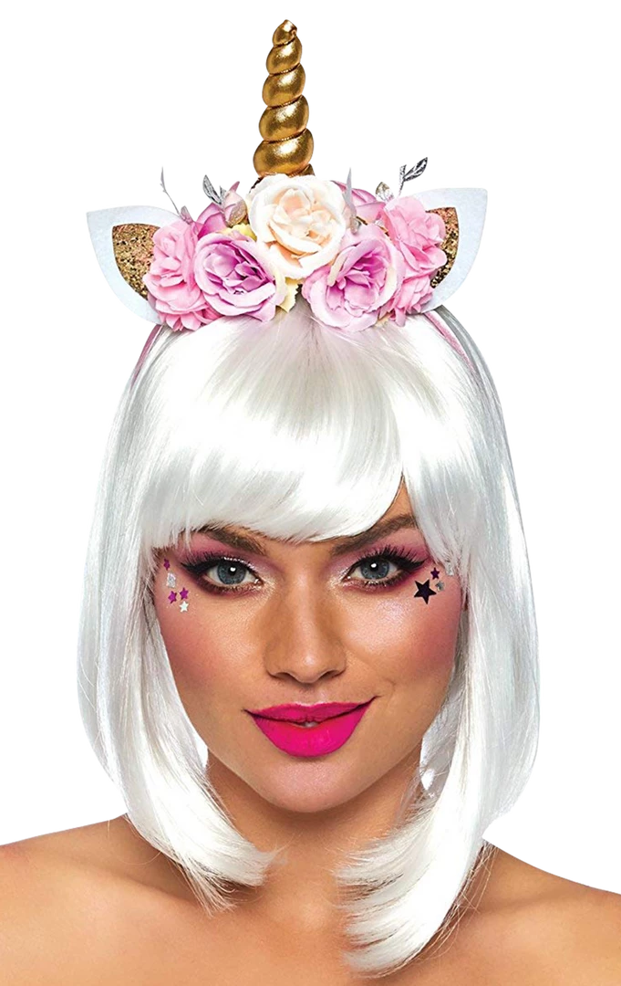 The golden unicorn horn is flanked by beautiful pastel-coloured roses and white and gold glittery ears!