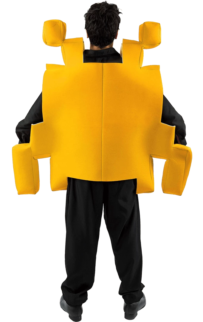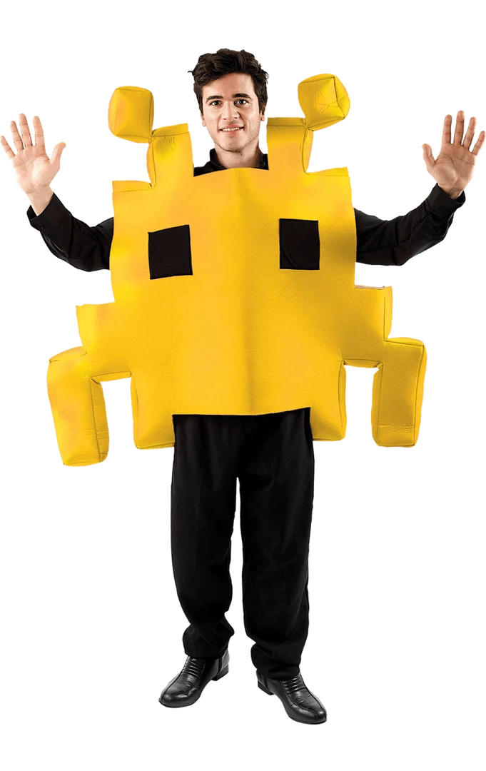 Get ready to fire in the Adult Yellow Space Arcade Game Costume! This costume includes a yellow overall with holes for head, arms and legs.