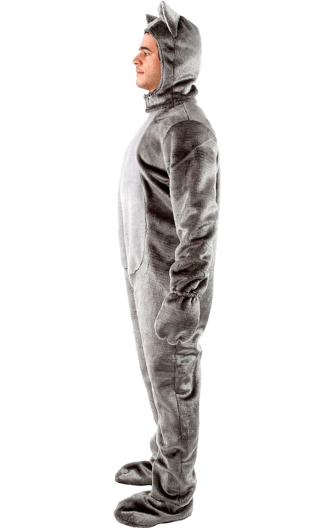 Eat eucalyptus in the Adult Koala Costume! This costume includes a grey jumpsuit with attached gloves and shoe covers and headpiece.