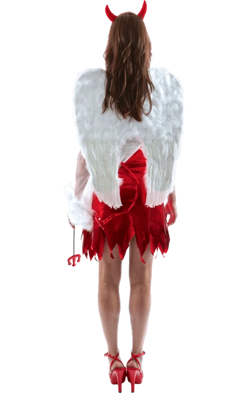 Play two characters in the Adult Angel & Devil Dress! This dress is half red with a flame edge finish and half white with a sheer sleeve.