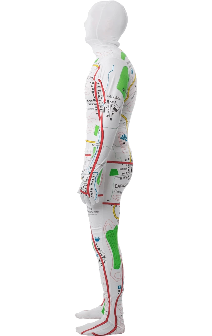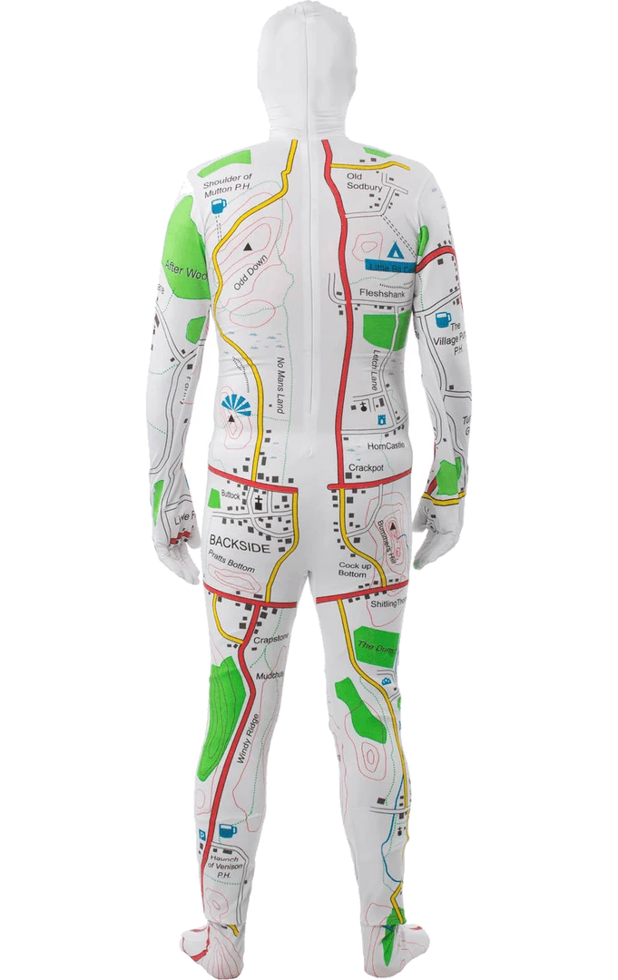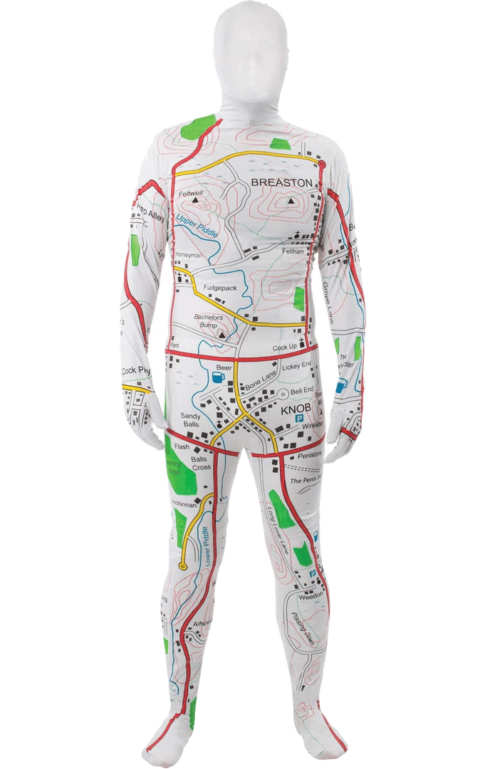 Cause laughter in the Adult Town Map Bell End Bodysuit! This novelty suit is white with a print of map and place names.