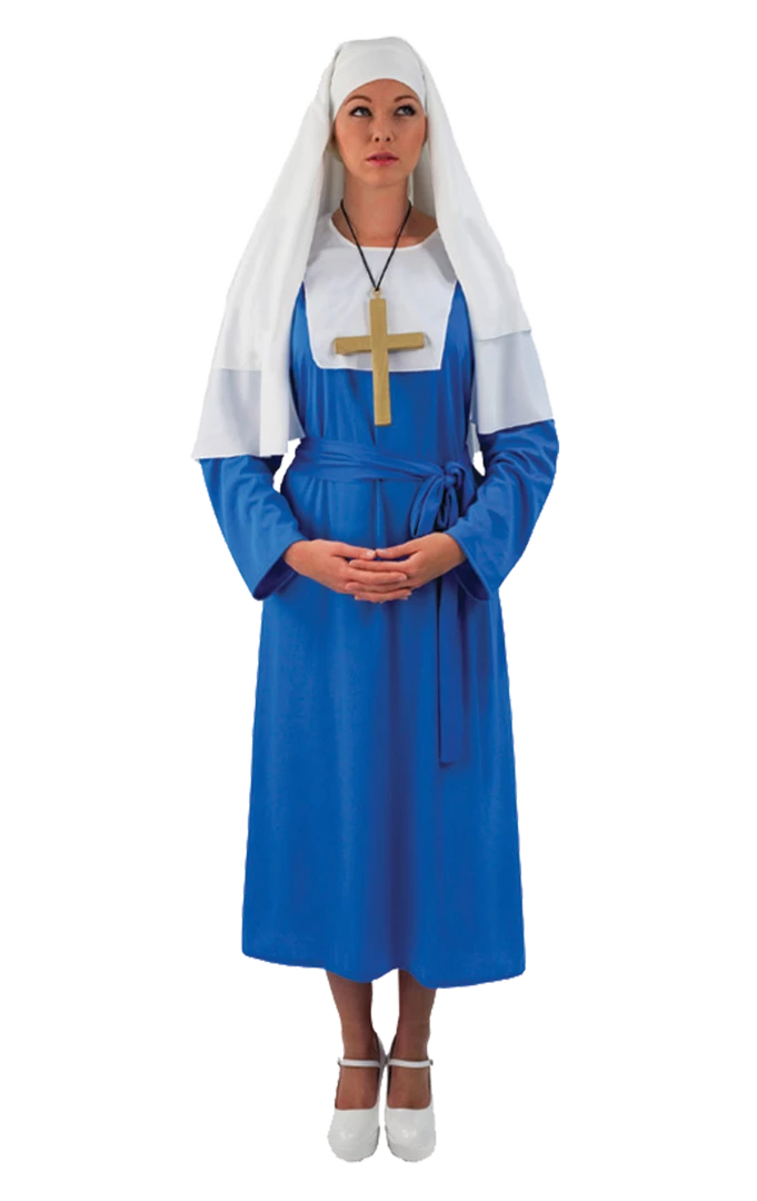Make a confession in the Adult Blue Nun Costume! The costume includes a blue and white dress, blue belt and white headpiece.