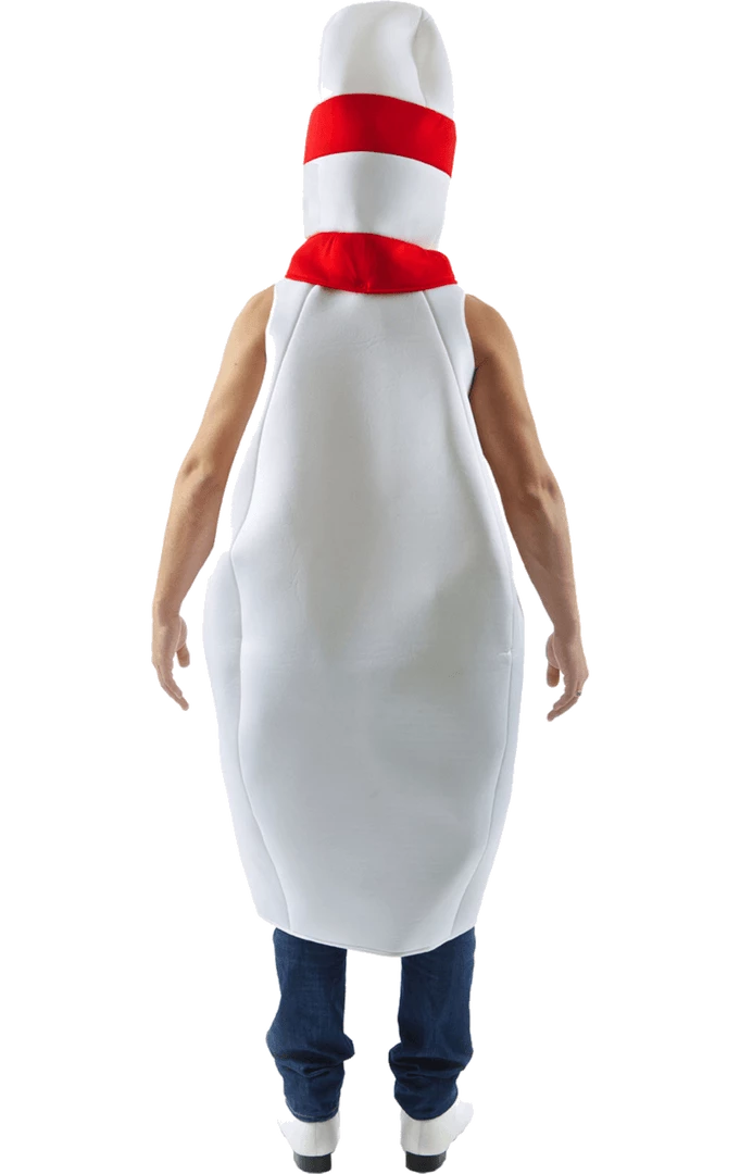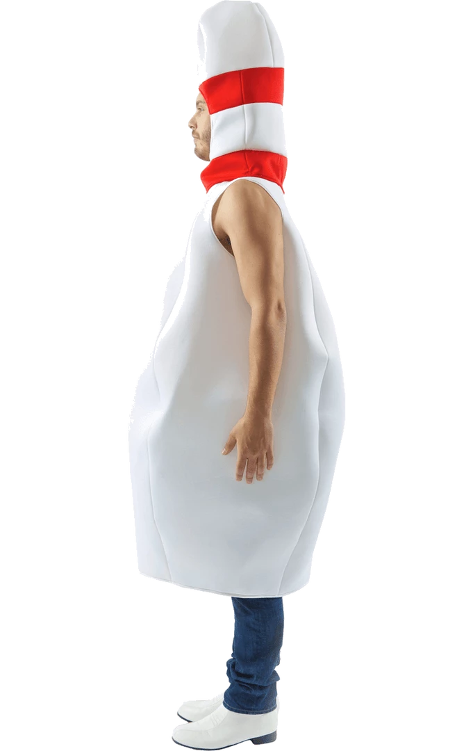 Get knocked down in the Adult Bowling Pin Costume! The costume comes a white and red pin shaped bodysuit and headpiece with hole for face.