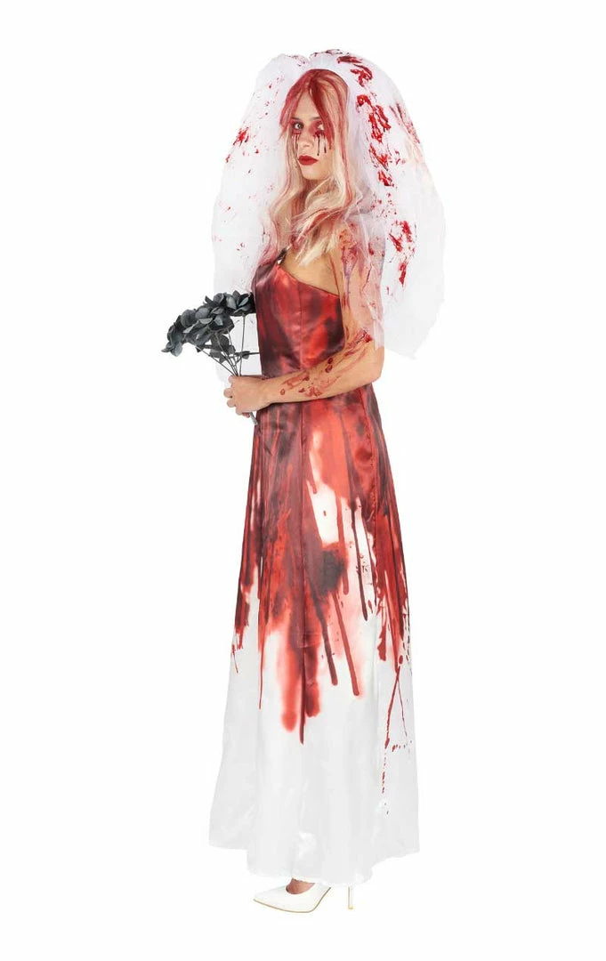 Make blood your accessory with the Ladies Bloody Bride Costume! This costume includes a long blood soaked dress and a blonde wig