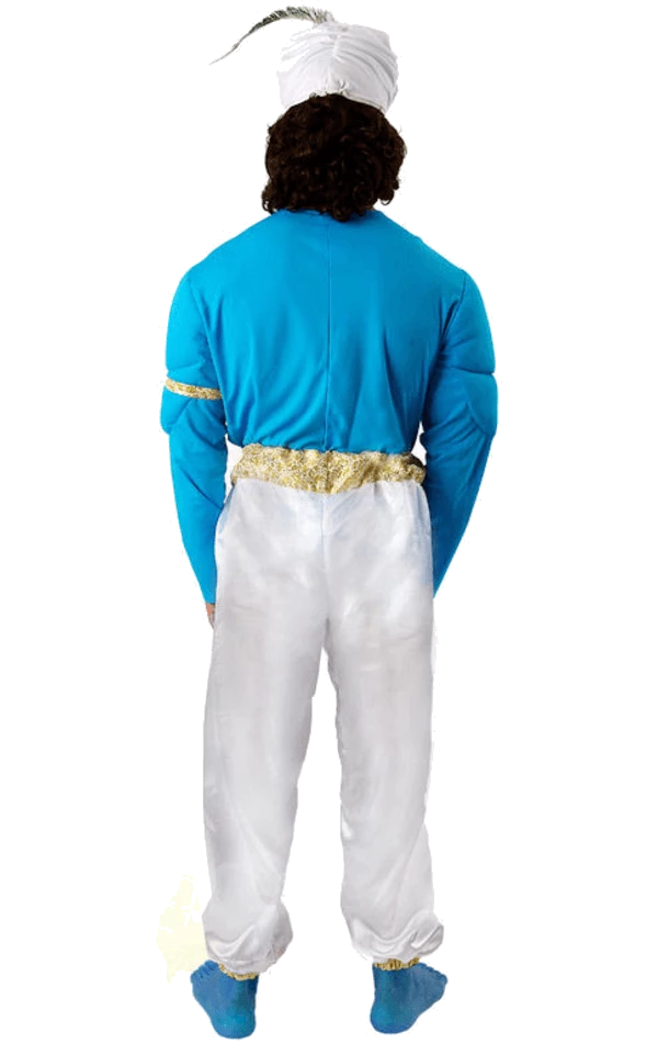 Ride on a magic carpet with the Men’s Genie Costume! This costume includes white trousers, blue muscle chest top and white turban with feather