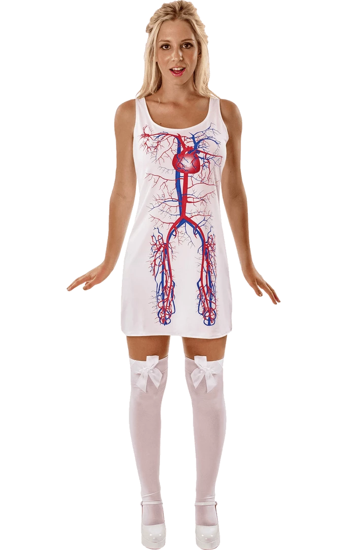 Get medical in the Adult Artery Dress! This dress is short and white with a blue and red vein and artery pattern.