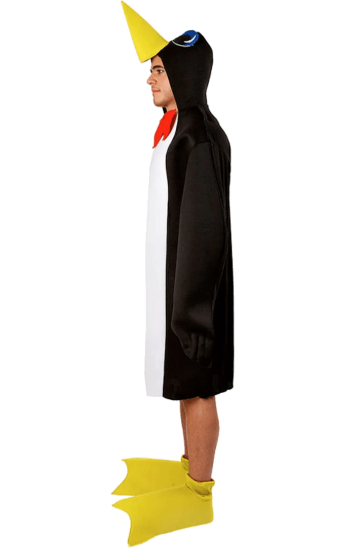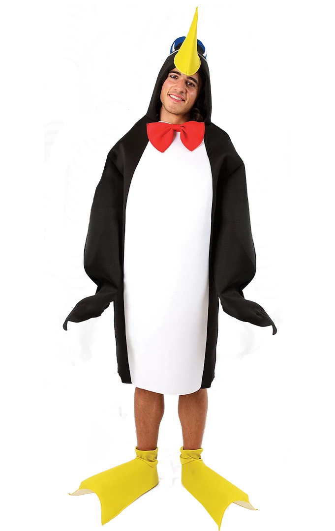 Show off your happy feet in the Adult Penguin Costume! This costume includes a black and white bodysuit with headpiece and yellow feet covers.