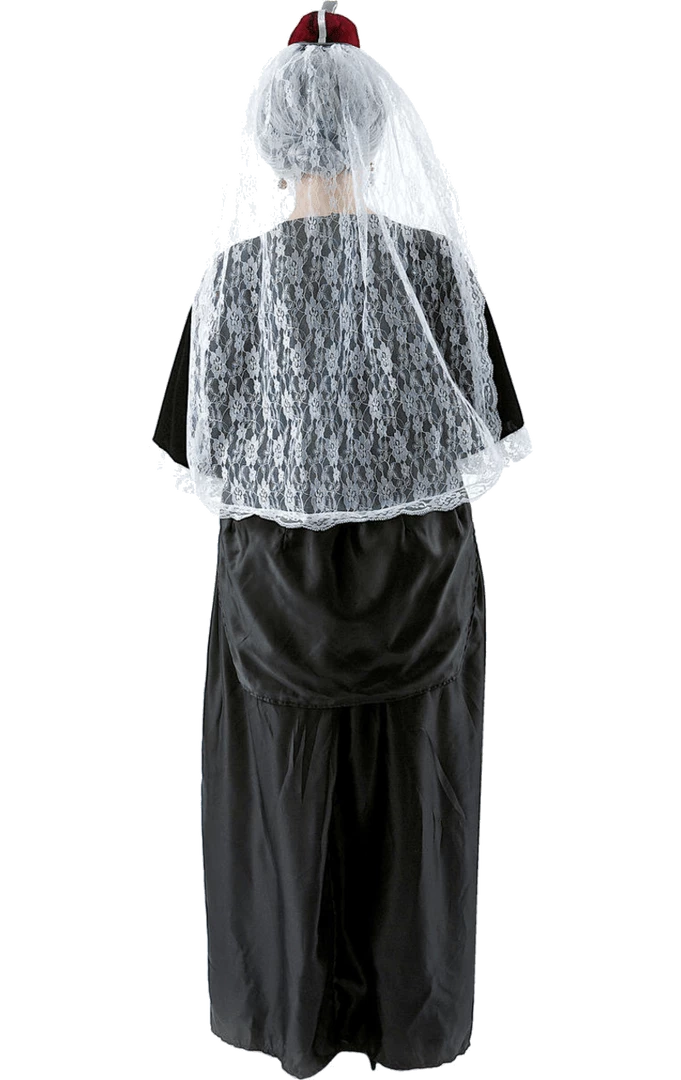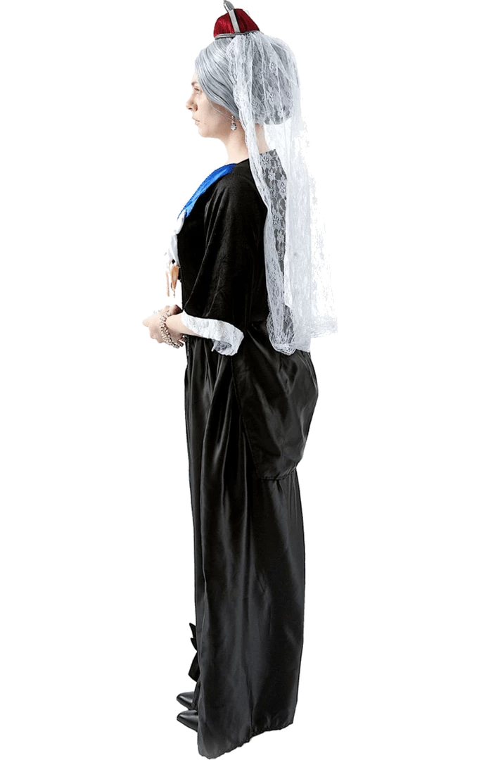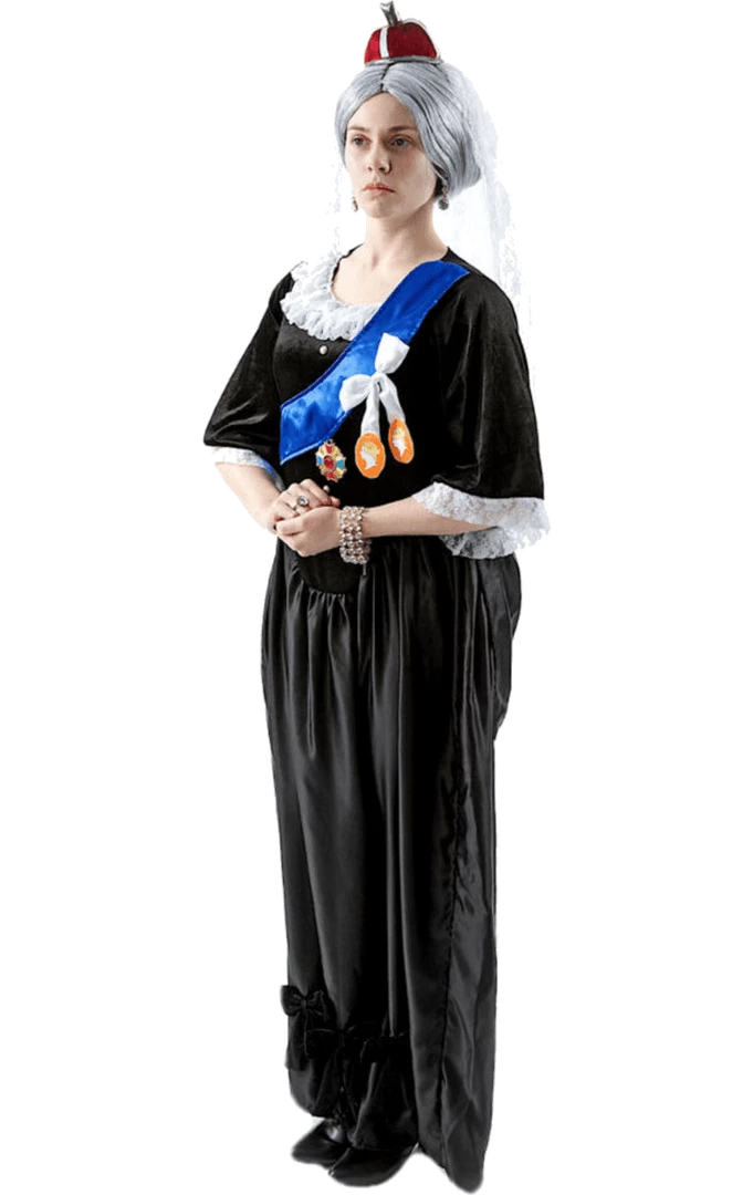 Rule the party in the Adult Queen Victoria Costume! The costume includes a long black and white trimmed dress with blue detailing and a headpiece with veil.