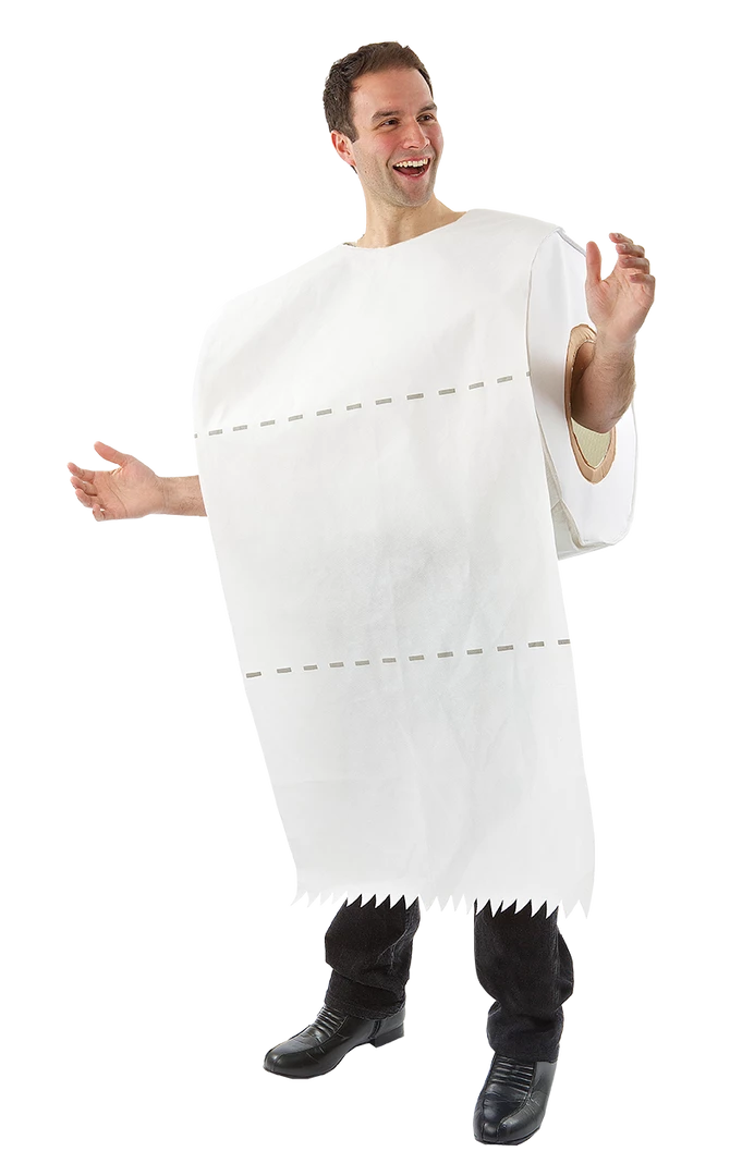 Show off your toilet humour with the Adult Toilet Roll Costume! This costume includes a white toilet roll bodysuit with a serrated edging.