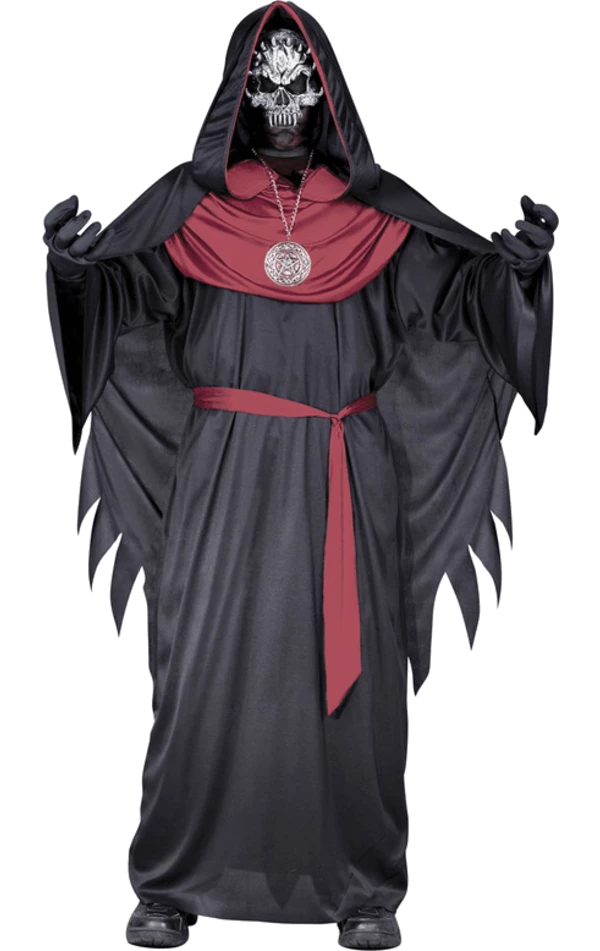 The Emperor of Evil Costume includes a long, black robe with detachable hooded capelet, burgundy waist sash and a scary skeleton facepiece.