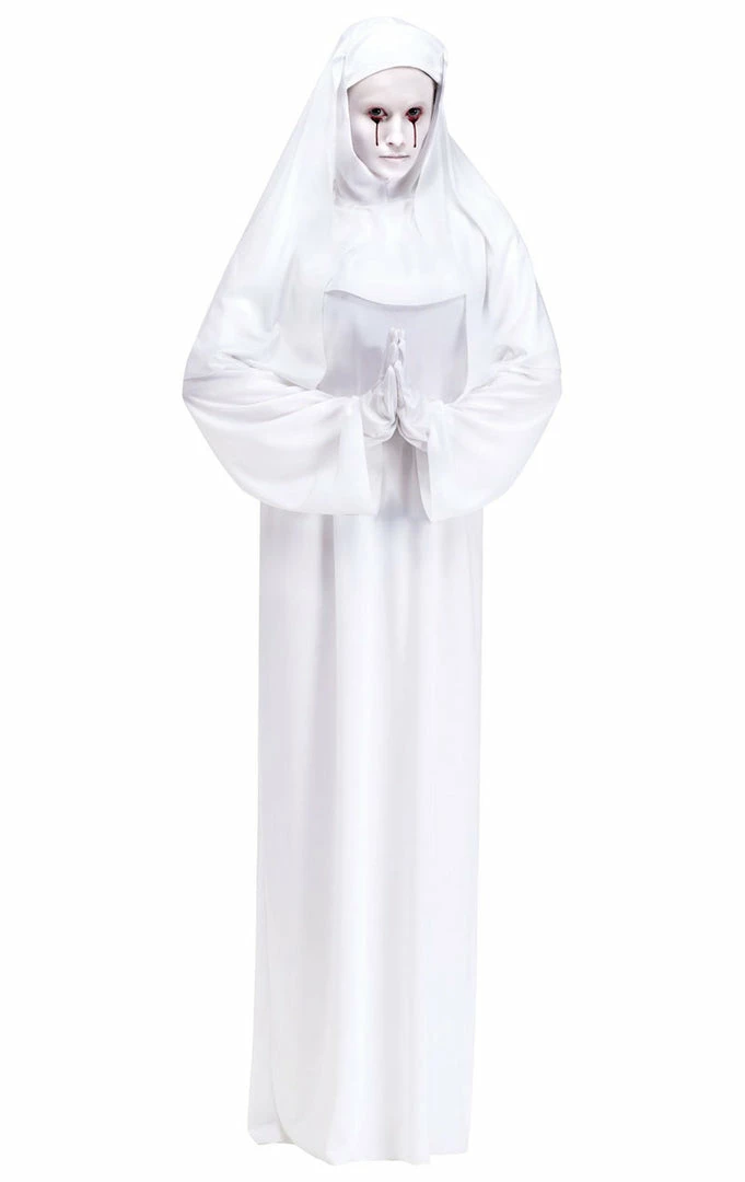 This creepy nun costume includes a deathly-white habit, headpiece with attached collar and veil and gloves.