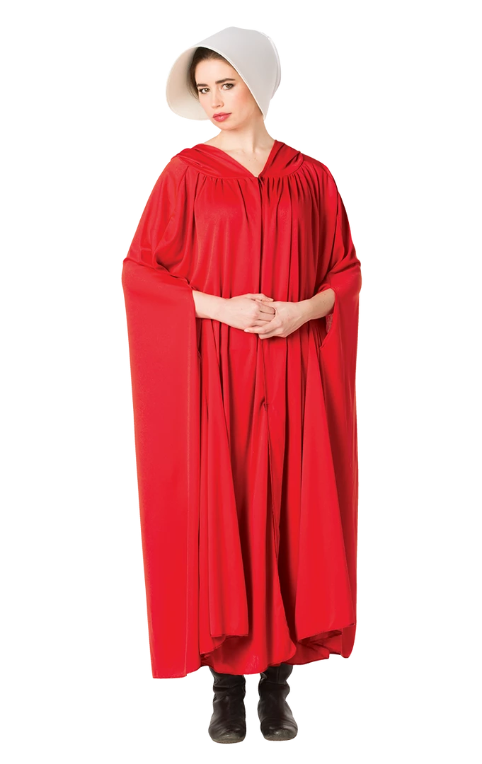 The Adults Fertility Cloak Costume features a long red cloak with dropped sleeves and a white large brimmed bonnet to cover most of the face.