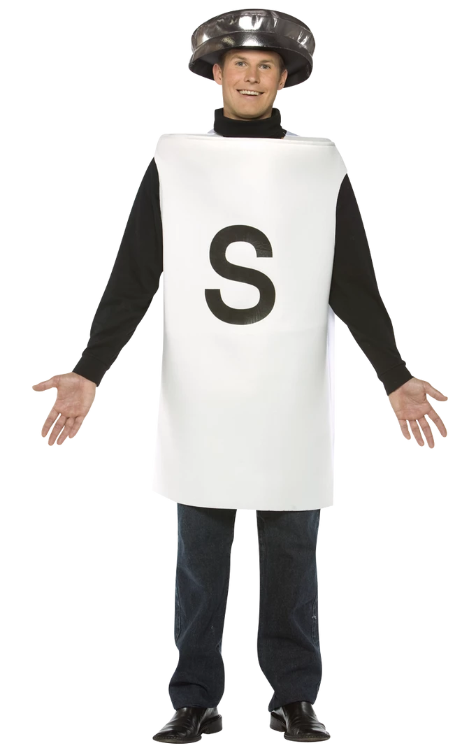 This funny Salt costume includes a long white unisex tunic with the letter “S” written on the front in black.