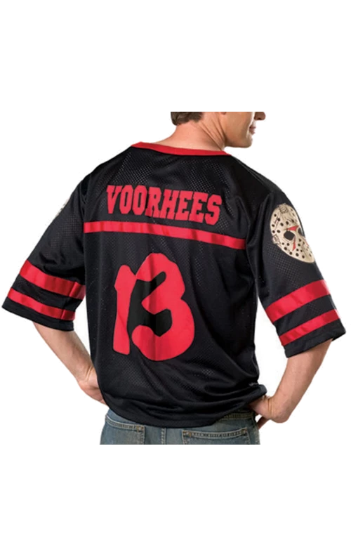 This famous character costume from the classic cult horror film series includes a black and red hockey shirt, with Jason logos and a player number printed on the back.