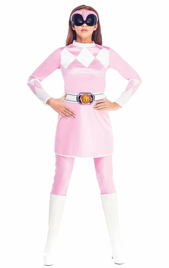 Join the other rangers in the Adult Pink Mighty Morphin Power Ranger Costume! This costume includes a dress, leggings and mask.