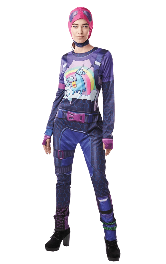 The future looks bright… The Brite Bomber Costume is a female outfit from the hit game Fortnite. It features a tight blue skinsuit with a unicorn design painted on the front and looks just like the limited edition character.