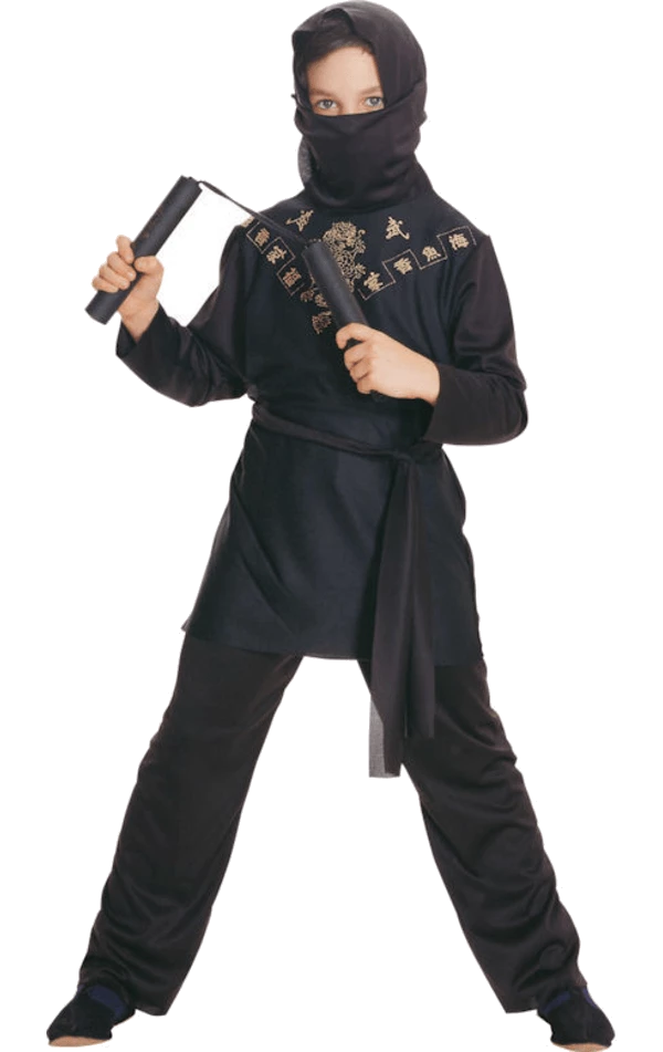 Costume includes long-sleeved black tunic top with gold Japanese symbols, waist sash, black trousers with elasticated waist and a black face mask to conceal identity.