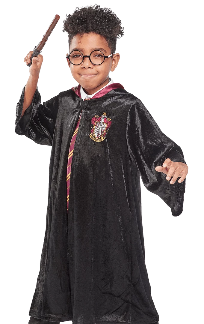 Cast a magical spell in the licensed Child Harry Potter Deluxe Robe! This long hooded robe is black with logo and a red interior lining.