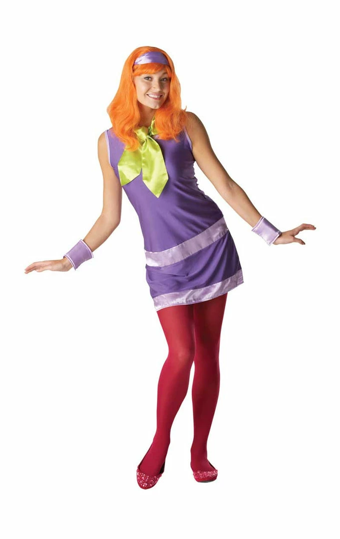 Seek out adventures in the licensed Adult Scooby-Doo Daphne Costume! The costume includes a sleeveless purple dress, green scarf, wig and cuffs.