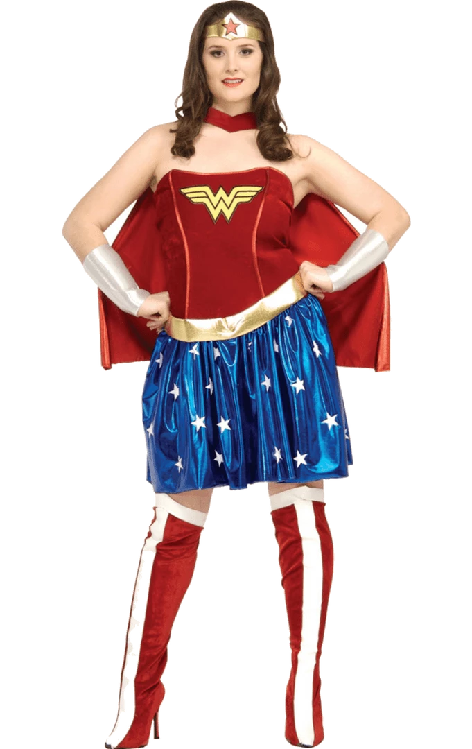 Be a sexy superhero in the Plus Size Wonder Woman Sexy Super Hero Costume! The costume includes a blue, red and gold dress, cape, belt, boot tops, bracelets and headpiece.
