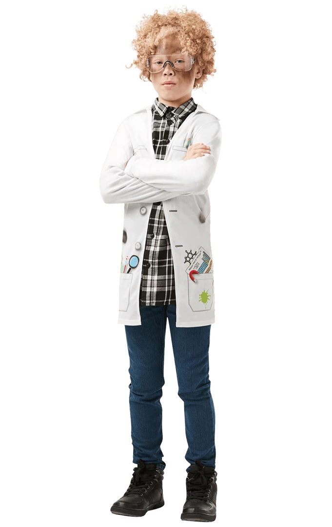 The kid’s Mad Scientist costume includes a lab coat with printed pockets, which hold every tool they could ever need to create scientific concoctions.