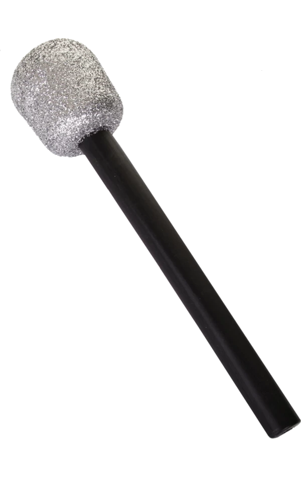 Realistic looking toy microphone with a black handle and a silver glitter top.