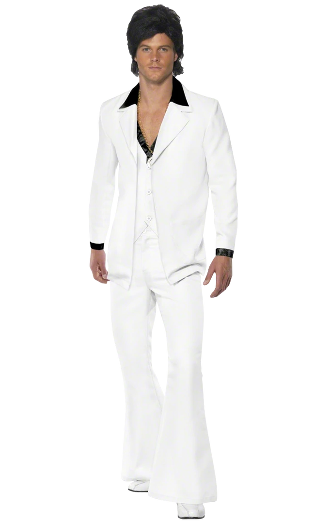 Dance the night away in this 1970s classic Adult 1970s White Suit! The suit includes a pair of white trousers and jacket with attached mock shirt and waistcoat.