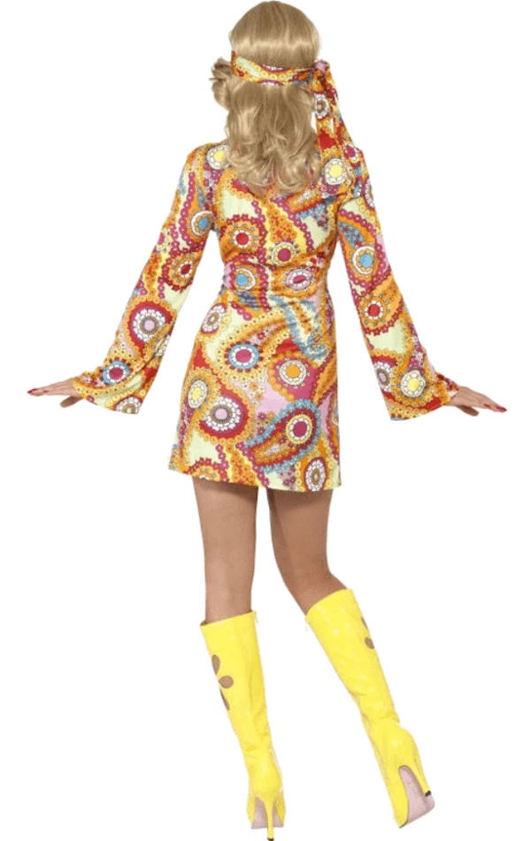 Get all psychedelic in the groovy Adult 60s Hippy Costume! The costume includes a short multicoloured dress with long sleeves and a matching head band.
