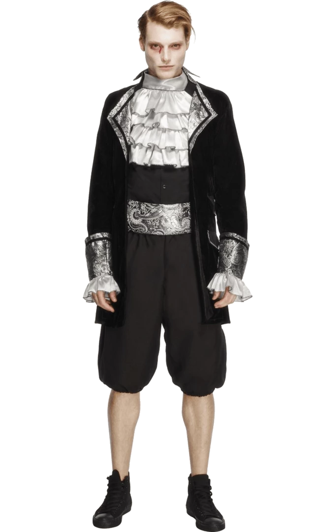 Bring class to Halloween with the Adult Fever Male Baroque Vampire Costume! The costume includes a jacket, trousers, cravat and cummerbund.