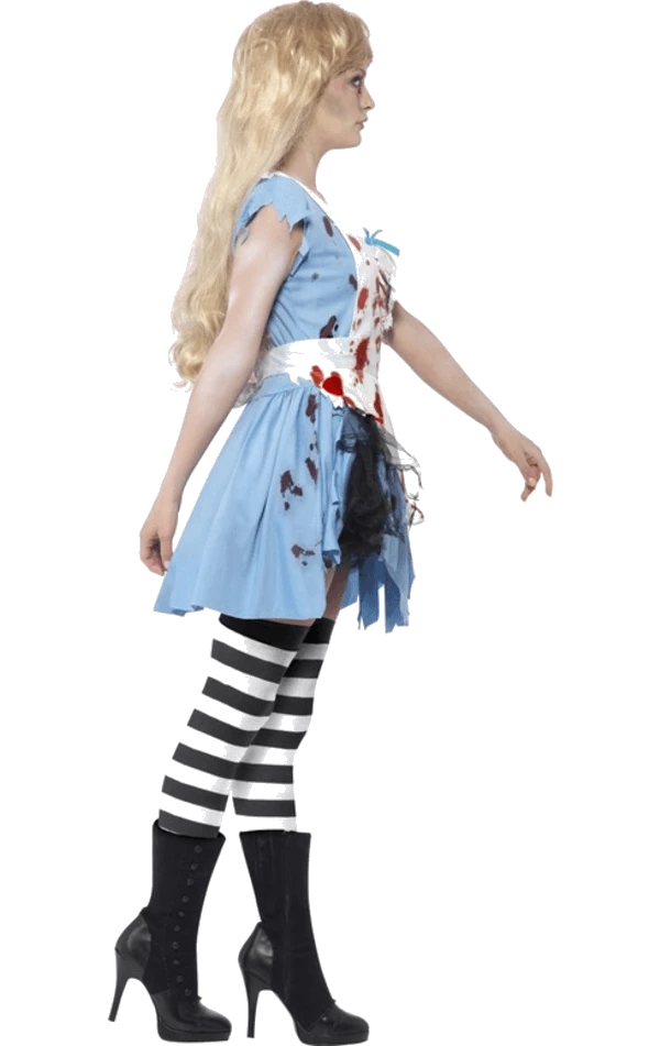 Fall into the Halloween party with the Adult Zombie Alice in Wonderland Costume! This costume includes a dress with latex chest, apron and headband.