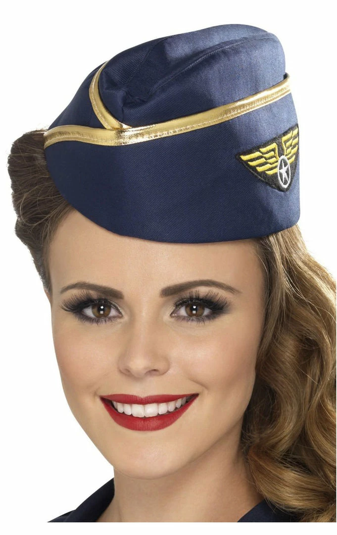 Going to a party as an air hostess? Make sure your hair is nicely done up and you are wearing a cute Air Hostess Hat accessory. This mini hat is styled in navy blue, with a gold lining on top and an airline badge on the side. It holds securely to the head thanks to the moulded inner foam piece, so you will definitely be ready for take off!