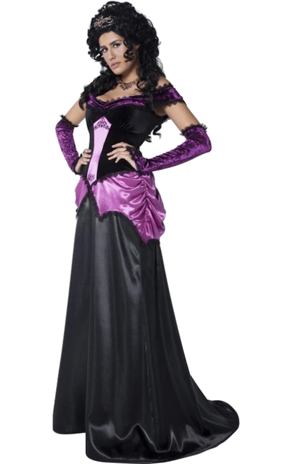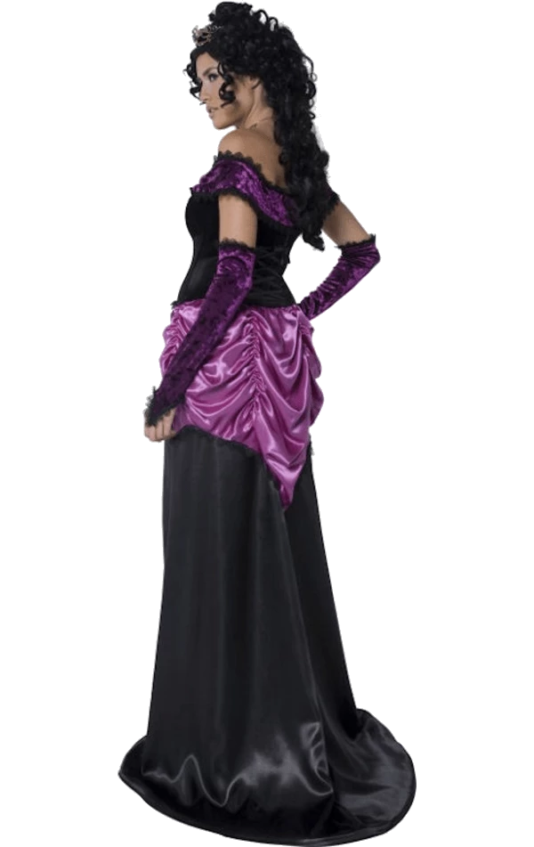 Designed in elegant Victorian style, the female vampire costume includes a long black and purple shimmering dress with a lace trim along the neckline, and a purple bustle.