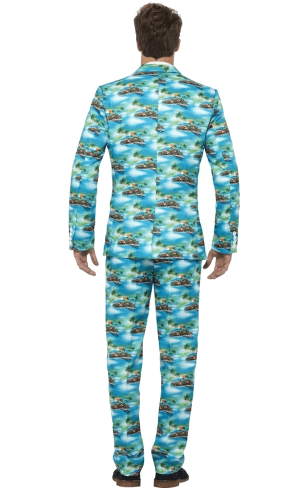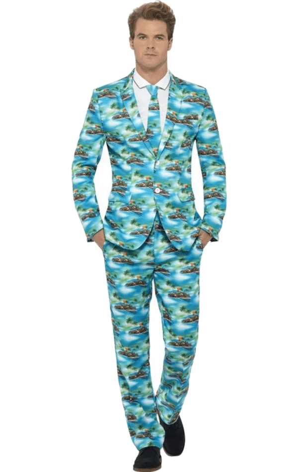 Feel the Hawaiian vibes with the Adult Aloha Patterned Stand Out Suit! The suit has a patterned Hawaiian style design and comes with a jacket, trousers and tie.