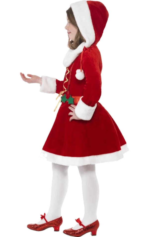 She will look festive this year in the Child Little Miss Santa Costume! The costume includes a red and white hooded dress with lace up front detail.