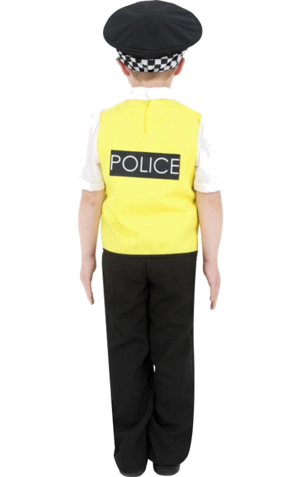 Command the party with the Child Police Boy Costume! The costume includes black trousers with white square design, yellow top with faux shirt, hat and toy radio set.