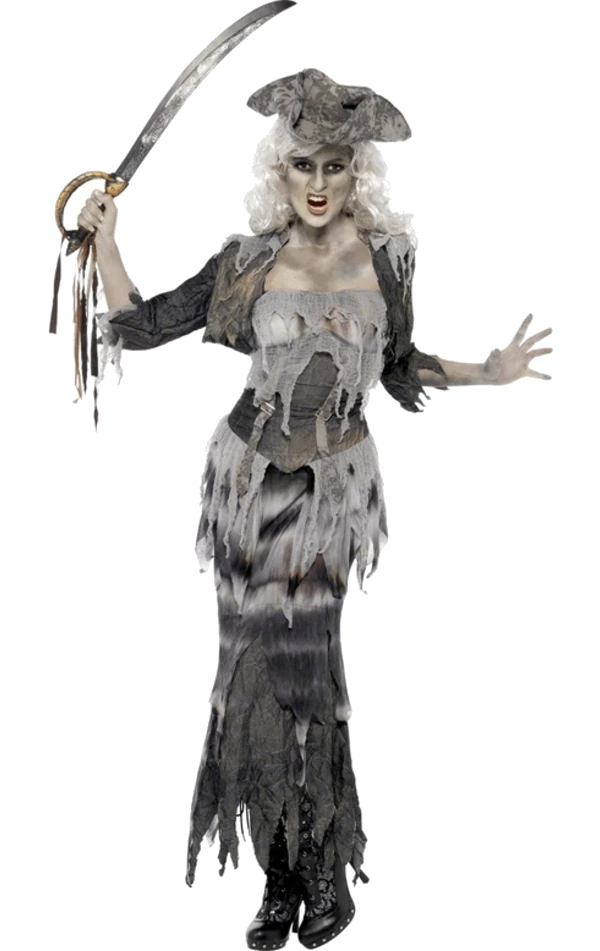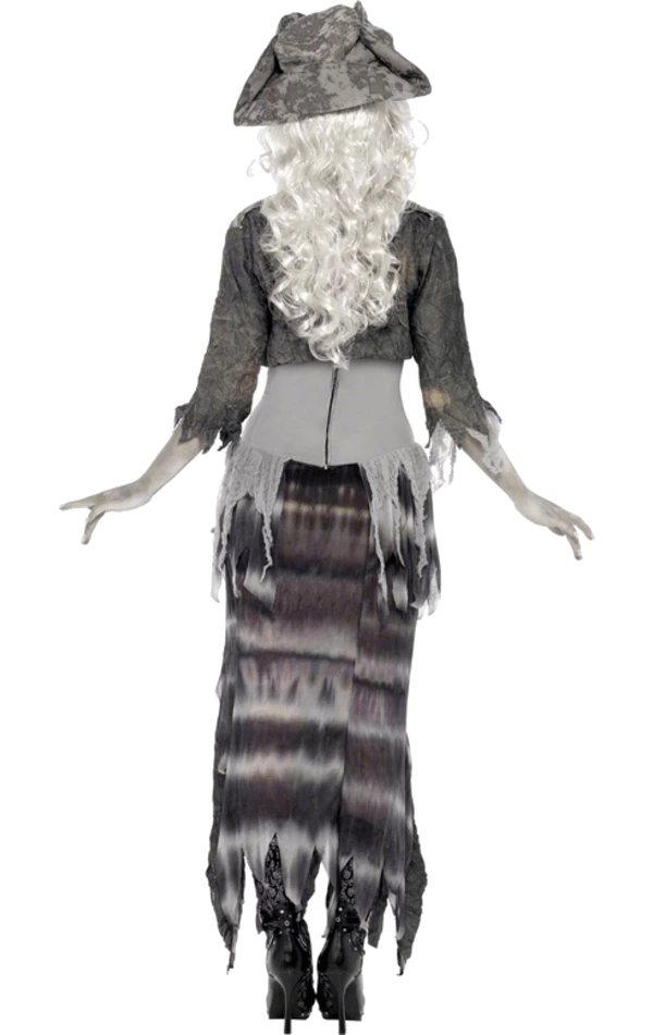 Be captain of the ghost ship in the Adult Ghost Ship Ghoulina Costume! This costume includes a tattered grey skirt, matching top, jacket and hat.