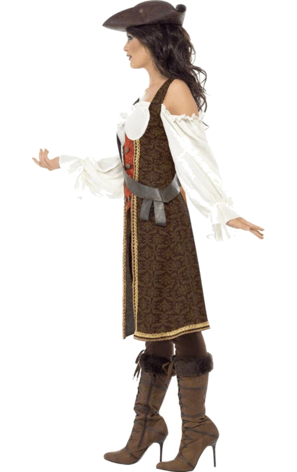 Walk the plank in style with the Adult High Seas Pirate Wench Costume! This costume includes a pair of trousers, dress and shoulder belt.