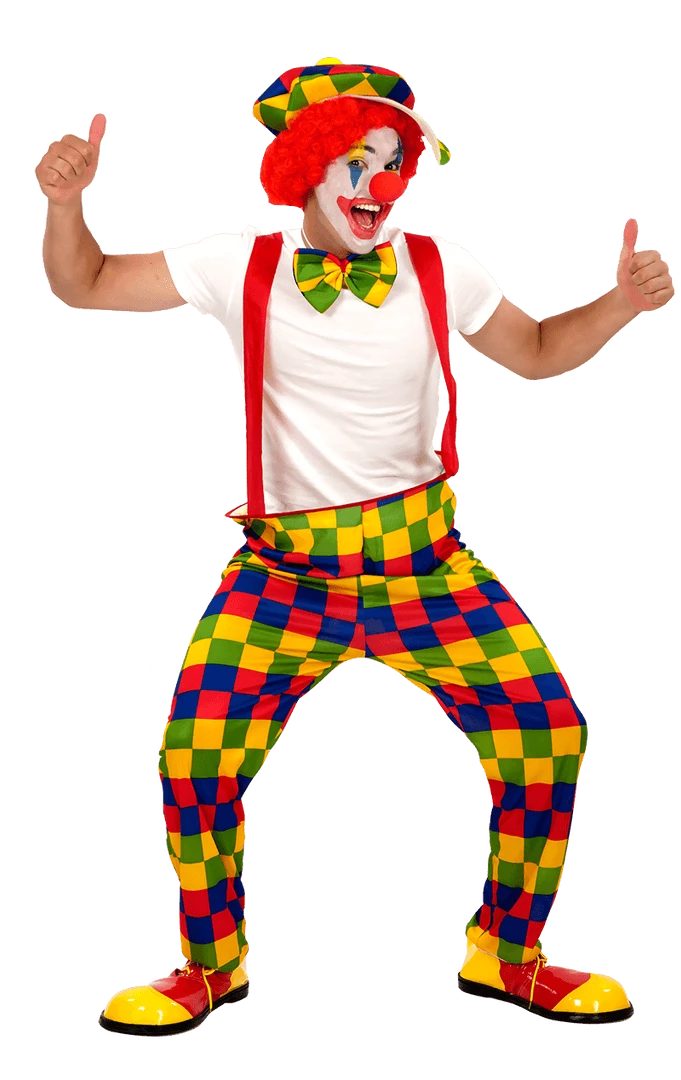 Get into circus mood by wearing the Adult Hooped Clown Costume! The costume include a pair of multicoloured hooped trousers with red braces and matching hat and bow tie.